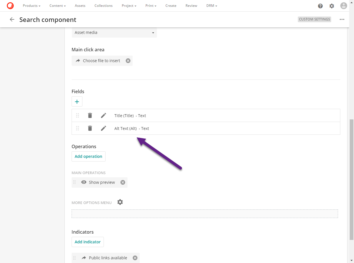 In our case, we added an additional field called Alt to store the proper compliant text. Once we add it to the M.Asset schema, we can add a value in the field.