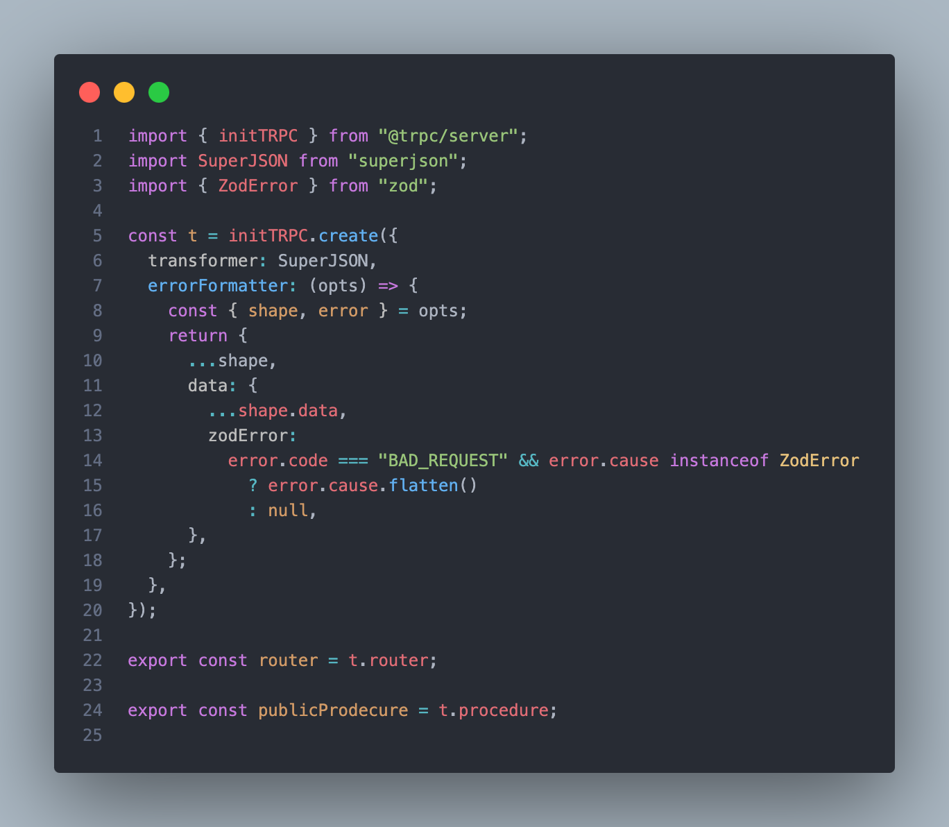 Here, initTRPC.create() initializes the tRPC instance with SuperJSON for automatic serialization and deserialization of complex data structures. We can also format errors to the structure that we want