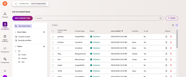 Content that from the beginning is the data that will be reusable on multiple pages or components should be placed in the Content Hub – this is an easy choice. If you think also about headless development and go back to the previous paragraphs where we discussed the purpose of headless API provided by XbK, it makes even more sense. Content stored inside Content Hub should be treated as modular content that is not designed to be displayed as it is, it stores the data that can be used to fulfill designed websites or applications.