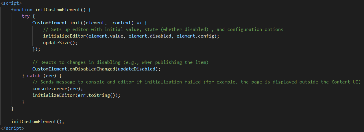 We now have to add the initCustomElement function which gets called from the parent, in this case, the Kontent interface. This call passing us the element info (current instance of our element with a value, disabled, etc), _context (the current context which includes item id, codename, language information, etc)