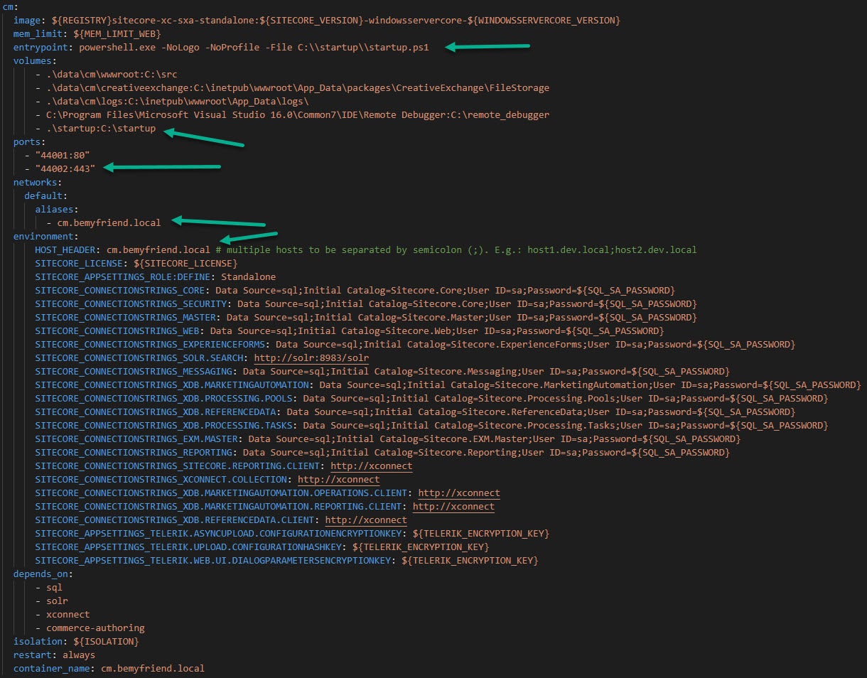 entrypoint: powershell.exe -Command "& C:\\tools\\entrypoints\\sitecore-xc-engine\\Development.ps1 -WatchDirectoryParameters @{ Path = 'C:\\src'; Destination = 'C:\\inetpub\\wwwroot'; ExcludeFiles = @('Web.config'); }" but in our case we will use entrypoint: powershell.exe -NoLogo -NoProfile -File C:\\startup\\startup.ps1[CmdletBinding()] param( [Parameter(Mandatory = $false)] [string]$EntryPointScriptPath = "C:\tools\entrypoints\iis\Development.ps1" ) Write-Host "Running startup.ps1" Import-Module WebAdministration $website = "Default Web Site" Write-Host "Checking if $($website) has any existing HTTPS bindings" $hostHeaders = "${env:HOST_HEADER}".Split(";", [System.StringSplitOptions]::RemoveEmptyEntries) function Set-HttpBinding { param( [string]$SiteName, [string]$HostHeader ) if ($null -eq (Get-WebBinding -Name $siteName | Where-Object { $_.BindingInformation -eq "*:80:$($hostHeader)" })) { Write-Host "Adding a new HTTP binding for $($siteName)" $binding = New-WebBinding -Name $siteName -Protocol http -IPAddress * -Port 80 -HostHeader $hostHeader } else { Write-Host "HTTP binding for $($siteName) already exists" } if ($null -eq (Get-WebBinding -Name $siteName | Where-Object { $_.BindingInformation -eq "*:443:$($hostHeader)" })) { Write-Host "Adding a new HTTPS binding for $($siteName)" $securePassword = (Get-Content -Path C:\startup\cert.password.txt) | ConvertTo-SecureString -AsPlainText -Force $cert = Import-PfxCertificate -Password $securePassword -CertStoreLocation Cert:\LocalMachine\root -FilePath C:\startup\cert.pfx $thumbprint = $cert.Thumbprint $binding = New-WebBinding -Name $siteName -Protocol https -IPAddress * -Port 443 -HostHeader $hostHeader $binding = Get-WebBinding -Name $siteName -Protocol https $binding.AddSslCertificate($thumbprint, "root") } else { Write-Host "HTTPS binding for $($siteName) already exists" } } foreach($hostheader in $hostHeaders) { Set-HttpBinding -SiteName $website -HostHeader $hostheader } Write-Host "Running $($EntryPointScriptPath)" & $EntryPointScriptPath The script looked for the ${env:HOST_HEADER} value and binds the local iis instance. Since our cert is a wildcard *.bemyfriend.local, it lets us set host names for all our containers easily.