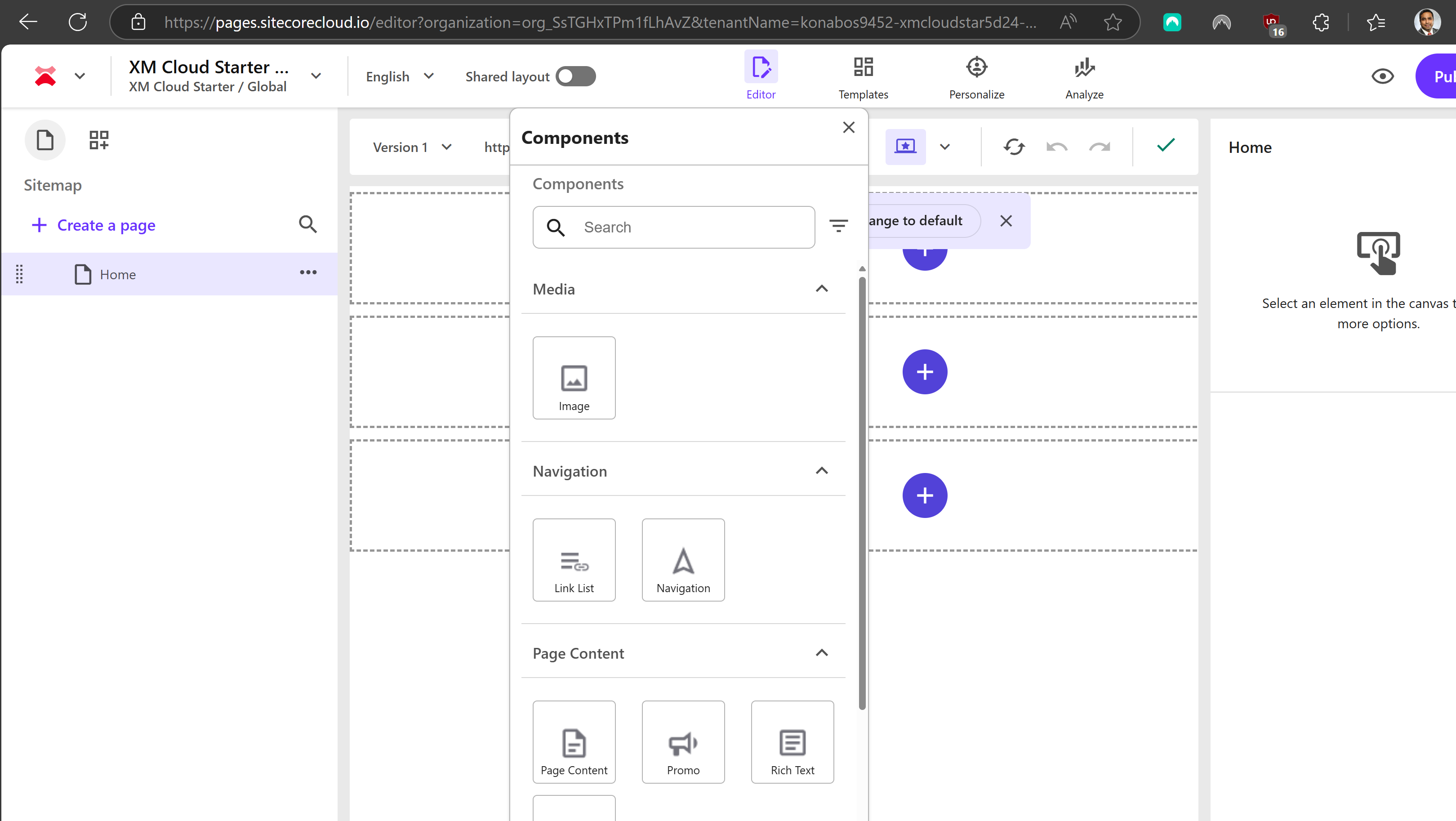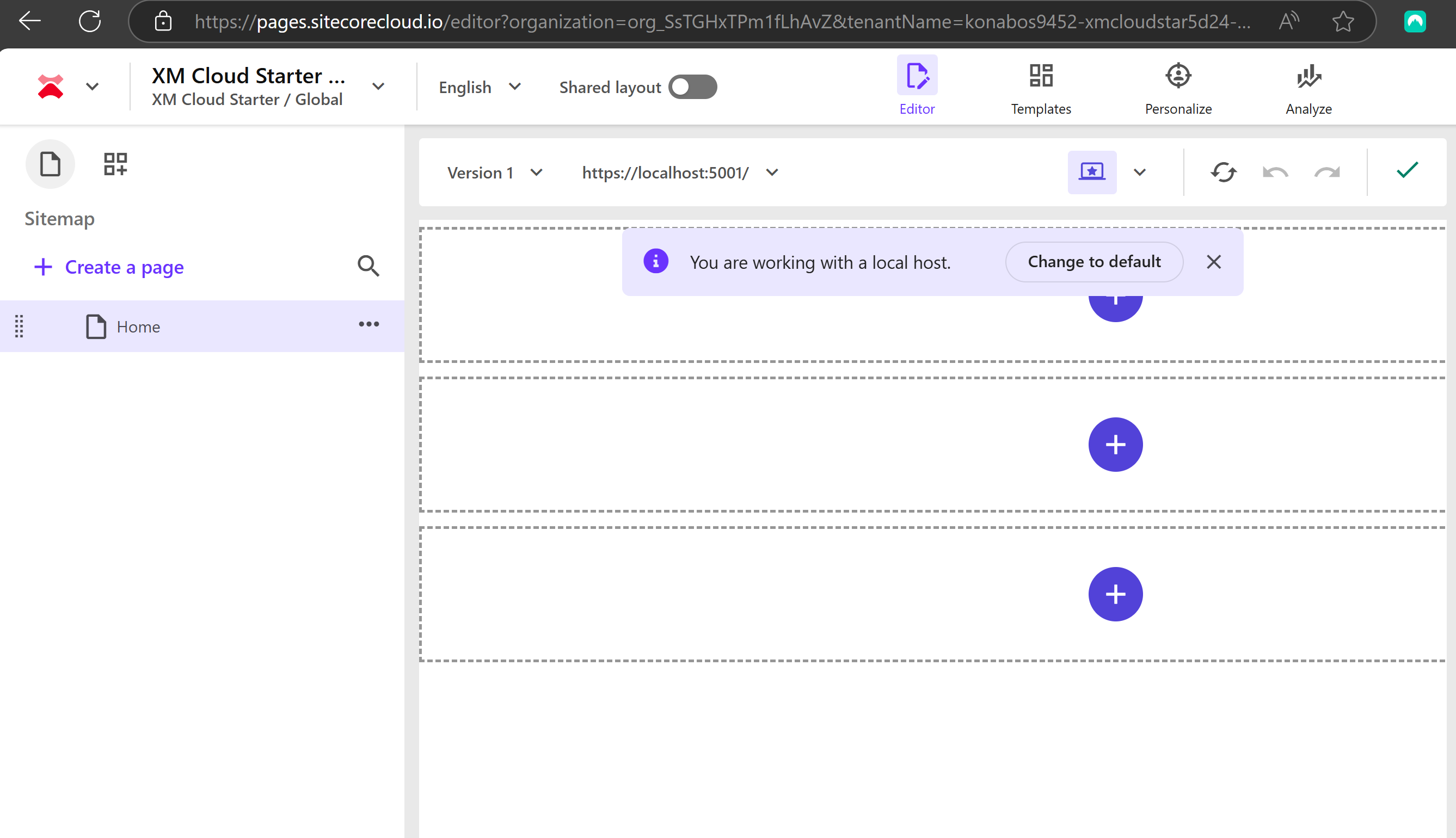 Now its time to connect this to the Pages Editor. Open the Pages application from your XM Cloud portal. Select Localhost as the editing host and enter your localhost url.