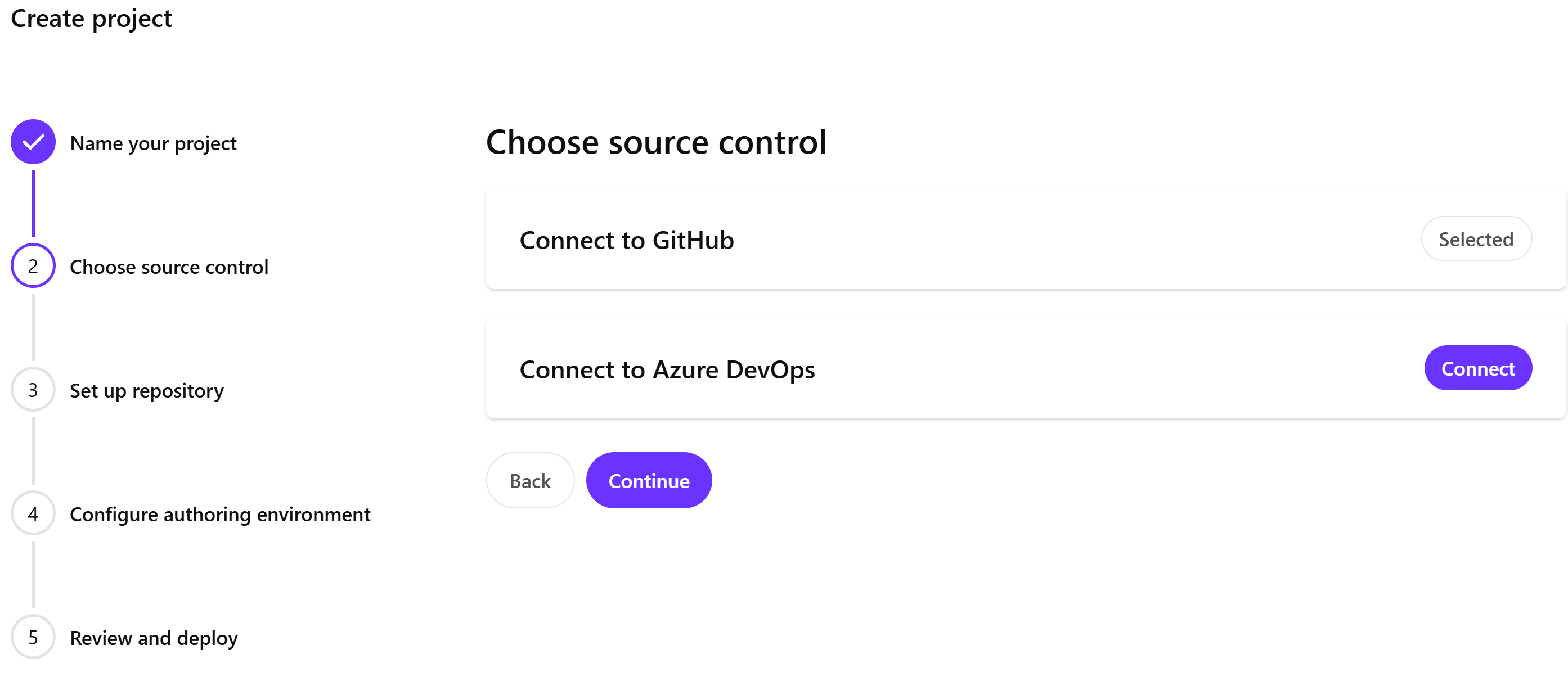 Select "Use your own code" in the Select the source of your code section, followed by selecting your GitHub, the repository we created and select the branch.