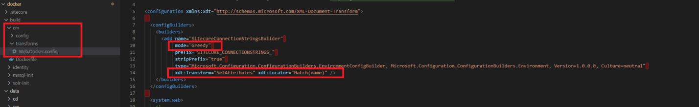 We have to change it so we can add our own connection strings and to do this, we will use transformation of the web.config file. We created a file called web.docker.config and placed it into the docker build cm folder: