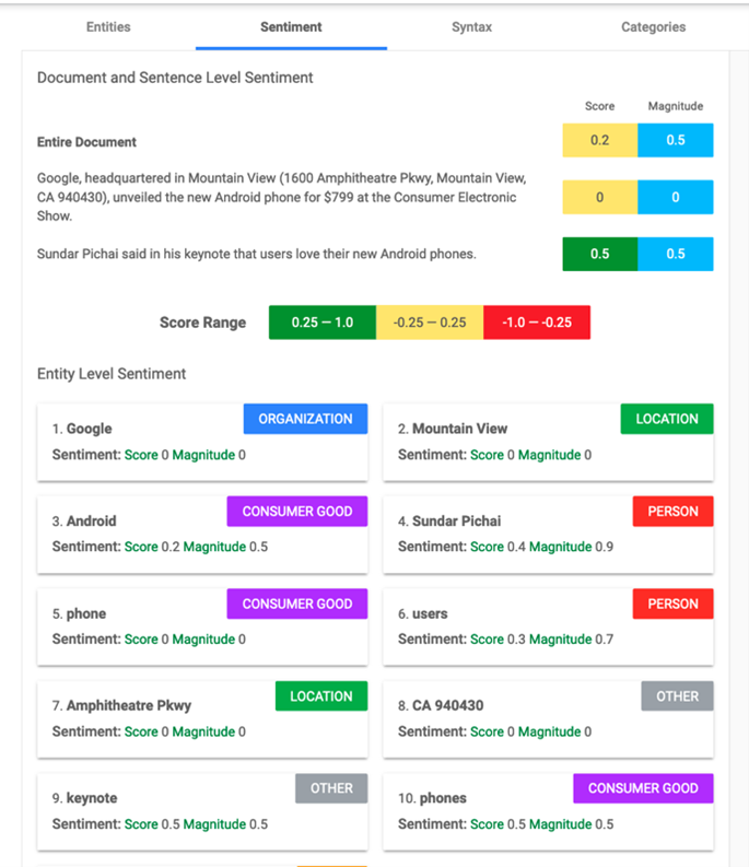 In the default example provided by Google below, we can see that each sentence is analyzed and given a score based on the words used and the entire sentence combined. Positive words (love, fantastic, wonderful) will have a higher score than neutral (with, car, mobile) and negative (hate, danger, disgusting) language.