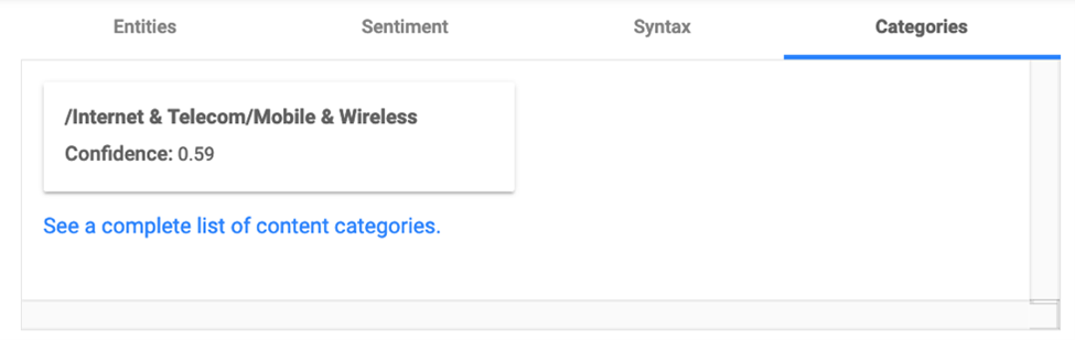 Categories reveal how Google classifies online text, along with a confidence score. The default example provided by Google is short and has a low confidence score, but a more robust block of text would most likely have subcategories and a higher score. Ideally, you would try to have your content obtain a high confidence score for the categories and subcategories you wish to rank.