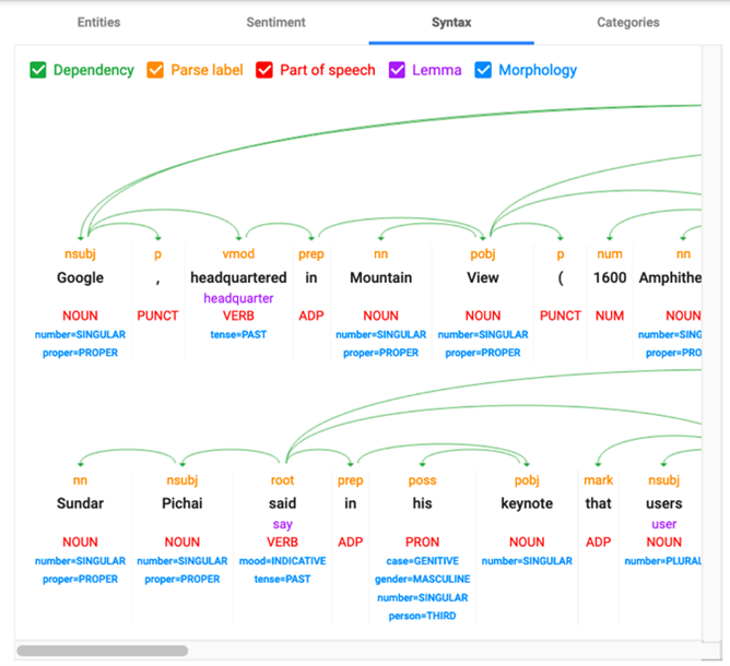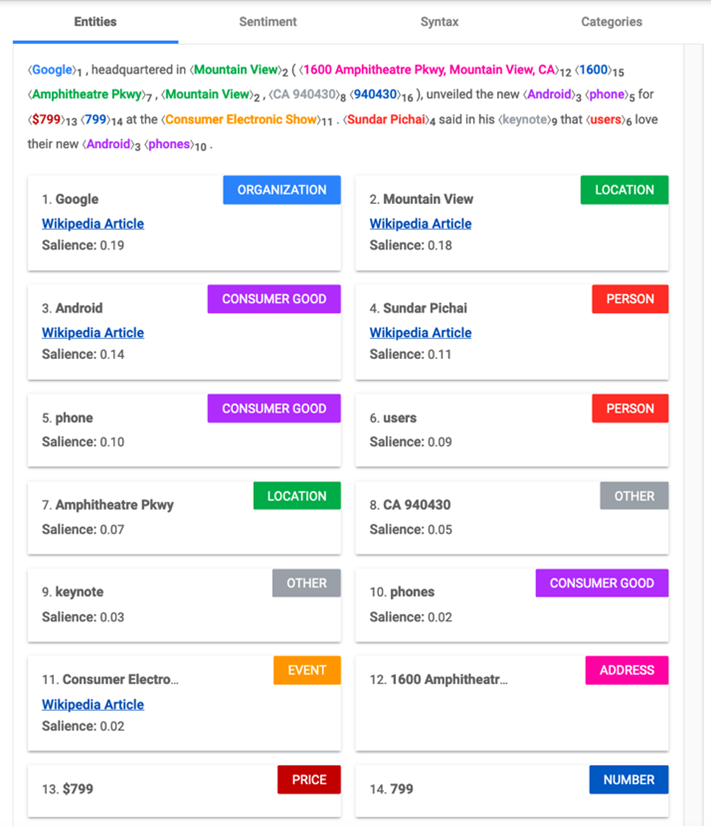 Google breaks down each word and phrase, classifies each into a category, and attributes a salience score to determine its relevance. Since each word is classified by events, objects, people, organization and so on, it’s safe to say that if Google takes the time to differentiate the categories, it most likely plays a vital role in the algorithm.