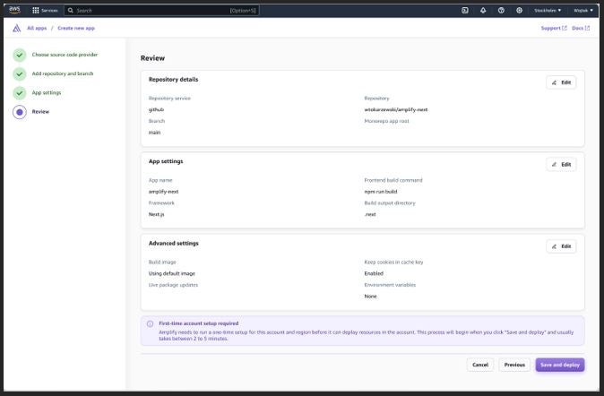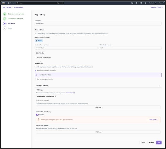 AWS Amplify will automatically recognize the framework you're using, which in our case is Next.js. It will also provide a basic configuration for the app.