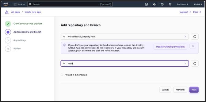 Once access is granted, choose the repository where your app is stored. Next, select the branch you wish to deploy (e.g., `main`) and click **Next**.