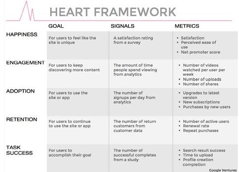 I strongly recommend the HEART framework: Happiness, Engagement, Adoption, Retention, and Task Success. These are categories, from which teams can then define the specific metrics that they will use to track progress towards goals.