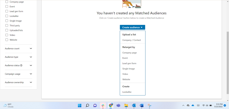 Use the account assets tab and then click on Matched Audiences from where you can select Create an audience for defining your audience. You can choose to retarget by website, video ads, Lead Gen Forms, or LinkedIn Event. Your audience list must be valid for 300 accounts to run the ads.