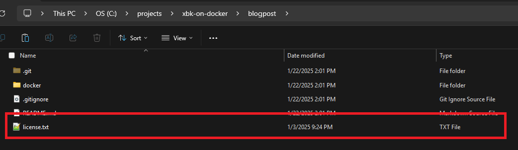 Now, you can place your license.txt file in this directory and you will be ready to compose your docker environment.