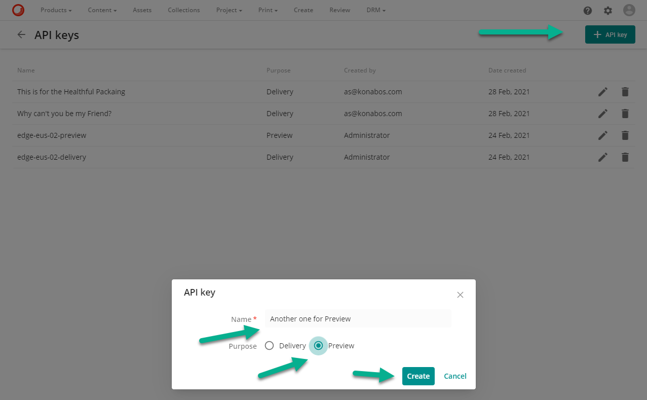 Click on the + API Key (add API Key) button, specify the name and create an API key for Delivery and Preview.